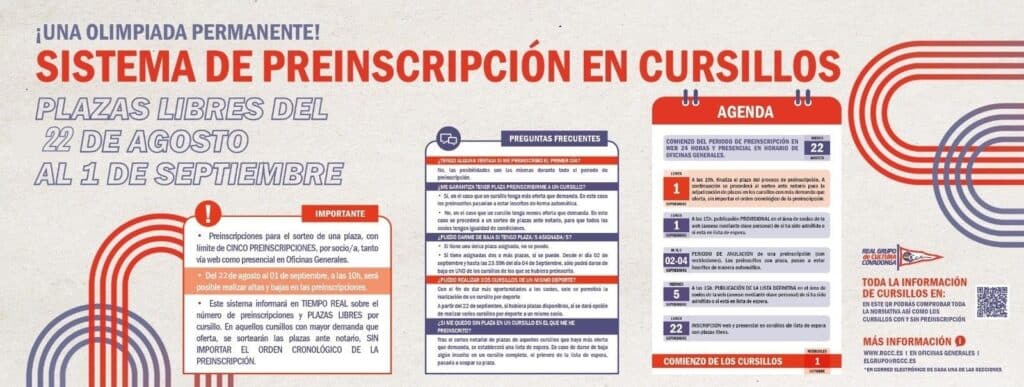 - Con el fin de dar un mejor servicio a los socios y para evitar las colas y esperas, pondremos de nuevo en marcha el proceso de Preinscripción para los cursos más demandados del Club. Este año se realizará durante el período desde el 22 agosto hasta el 1 de Septiembre a las 10:00h, ambos inclusive, para las plazas libres de todos los cursillos de invierno que comiencen en octubre. Durante este periodo, será posible realizar altas/bajas en las preinscripciones.